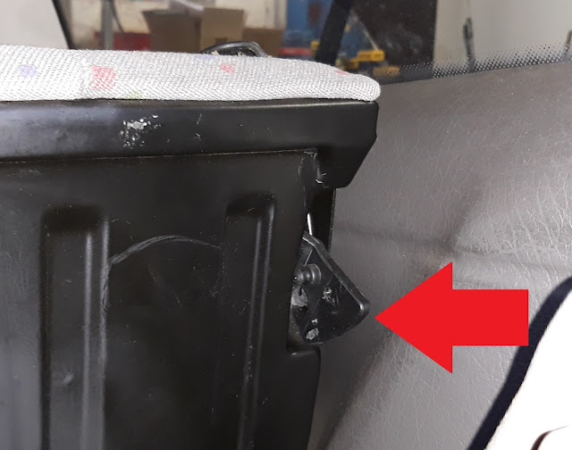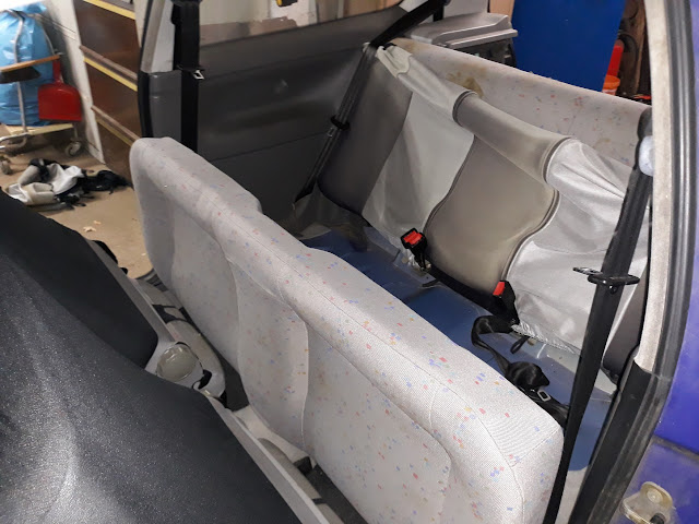 Die Rücksitzbank bzw. ihr Polsterbezug hat die letzten 20 Jahre deutlich besser überstanden. Hier hat der Schonbezug seinem Namen alle Ehre gemacht. Dafür gibt es hier ein anderes Problem; die Griffe zum Entriegeln der Lehne sind abgebrochen. So können keine sperrigen Gegenstände transportiert und keine neue Sitzüberzüge aufgespannt werden. Keine Ahnung ob das ein typischer Defekt beim VW Polo 6N ist. Wir müssen jedenfalls eine praktikable Lösung finden. Vorher muss die Bank erstmal umgeklappt werden. Dafür benötigt man lediglich einen langen Schlitzschraubendreher mit dem man vom Kofferraum aus, an der Verkleidung vorbei gegen die Fanghaken drücken und diese anheben kann. Der schwerste Teil dabei ist es die Haken auf beiden Seiten gleichzeitig zu entriegeln.