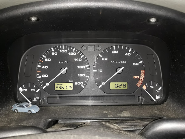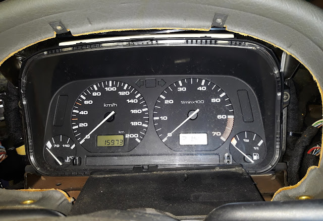 Damit kommen wir auch schon fast zum Ende dieses Autos. Ein kaufwilliger Interessent im weiteren Bekanntenkreis hat sich bereits gefunden. Nur ein Detail verhindert derzeit noch das Geschäft; der Tacho funktioniert nicht. So kann man nicht wirklich gut auf der Straße fahren und vorschriftsmäßig ist es auch nicht. Der Fehler ist schon länger bekannt und beim letzten Besuch hatten wir schon den Tachogeber am Getriebe getauscht, was offenbar keine Lösung war. Dann liegt der Fehler vermutlich beim Kombiinstrument selbst. Wie gut dass dieses Teil schon Selbstdiagnose-Fähig ist. Einfach den Tageskilometer-Rückstellknopf drücken und festhalten, Zündung einschalten, Zündung ausschalten, Zündung einschalten und den Knopf loslassen. Mit dem Rückstellknopf kann man nun durch 7 verschiedene Menüs springen die mehr oder weniger viel Aussagekraft haben.