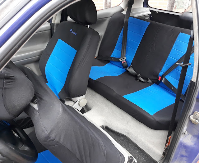Damit hier in Zukunft nicht immer so fummelig die Entriegelung betätigt werden muss, nehmen wir einfach zwei lange Kabelbinder die wir genau dort an den Fanghaken befestigen wo zuvor die originalen Griffe montiert waren. Das klappt auch noch in Verbindung mit den neuen Überzügen für die Sitzbank. Die Montage ist wie immer fummelig und je nach Fahrzeug passen die Bezüge mal mehr und mal weniger gut. Immerhin hat dieser Polo keine Airbags in den Sitzen so dass wir uns um diesen Aspekt keine Gedanken machen müssen. Egal ob die neuen schwarz-blauen Überzüge jedermann gefallen oder nicht. Es ist definitiv eine Verbesserung zum Ausgangszustand. Bis auf die Kopfstützen ist die Passform auch gar nicht so schlecht wie zu Anfang befürchtet.